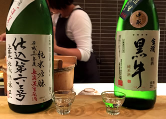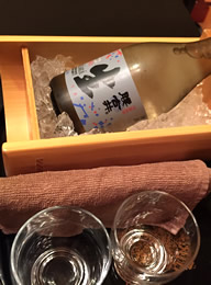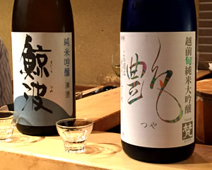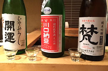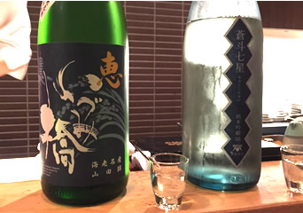 日本酒好きの飲兵衛集合で、この後は怒涛の日本酒ラッシュになった。 こちらは、日本酒は、“味見”してから、オーダーできるというシステムをとっていて、自分好みの酒を探す楽しみもある。 隣に座ってる倉嶋さんの勢いにつられて、酒が進む〜! ちょっとずつ飲んでるつもりでも、気がつけば、かなりの量だ(笑) |