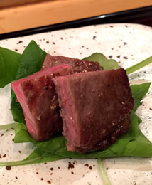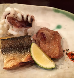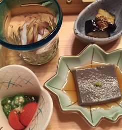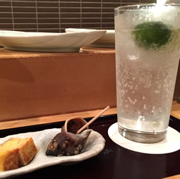 | 今夜は、「すだちサワー」からスタート。 『「ワサビサワー」や、「ガリサワー」も作りますよ〜』と、 ハキハキ明るいご主人は、二代目との事。 爽やかでとても素敵な青年でした☆ 「突き出し」からはじまって、 旬の食材を使った和食のプチコースが展開されていきます。 どれも、食べる人の事を考えられた“おもてなし心たっぷりの品”。 作りこみ過ぎないシンプルな雰囲気がまたイイ感じだなぁ♪ |