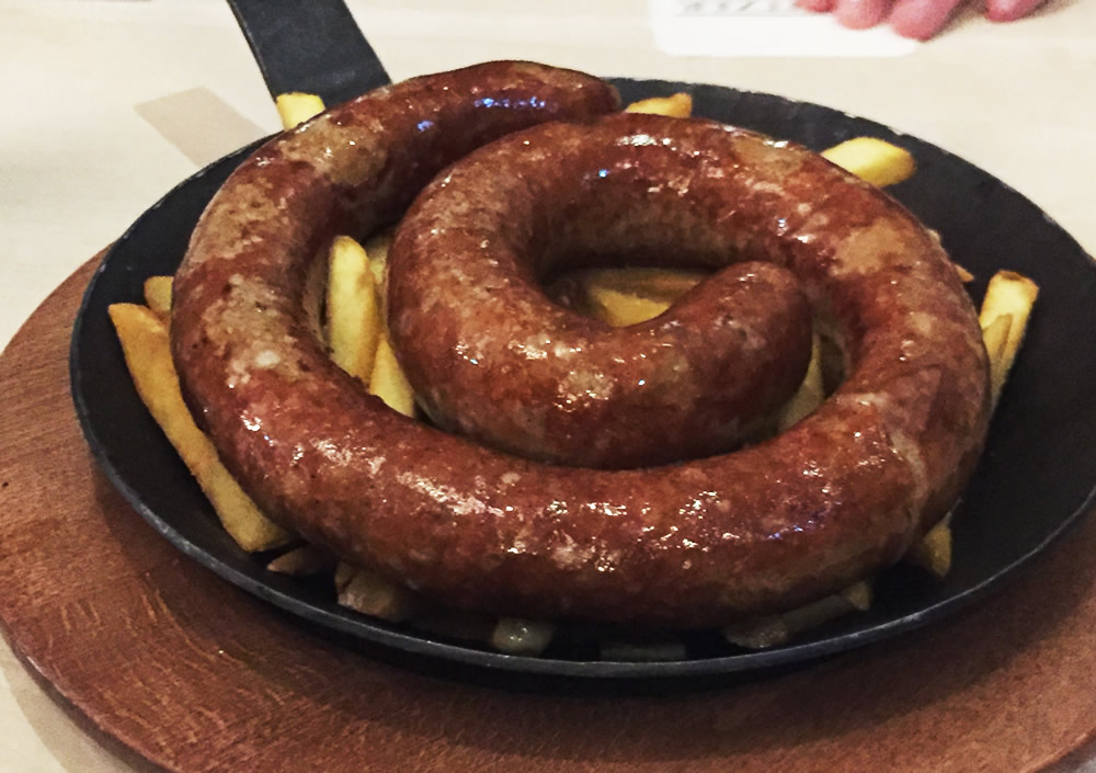 だから、このボリューミーな一皿を一人で抱えて食べることになる。この長くて太いソーセージとポテトフライを、ビールでひたすら流し込むのだ。