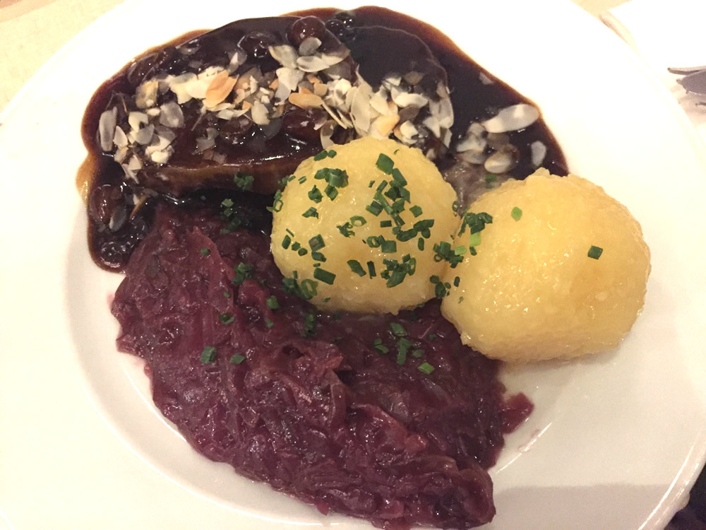 通常のザワークラウト(酢漬けキャベツ)ではなく、赤キャベツで作られた酸味が強めのザワークラウトが添えられた甘酸っぱい煮込み料理。