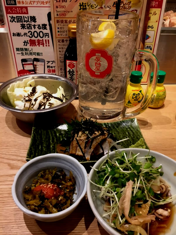 専用アプリをスマホに入れて入会金を支払うとお通し(塩昆布キャベツ)がずっと無料になる。