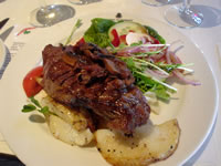| このワイナリーで試飲をしながら昼食を取ります。 左から「セミヨン種の白」・「今年のヌーボー,ショルドネ」・「シラーズ種」・「メルロー種」。オーストラリアワインのイメージを覆す繊細さを持った「メルロー種」が一番気に入りました! ちなみに写真手前の白い紙は、ここのワインを大量オーダーするための注文書です。さすがに、このツアー参加者でケース買いする人はいなかったけど。 体調もかなり復活した私…ステーキをオーダー。 こっちにきてはじめてのオージービーフ…楽しみ〜☆ |