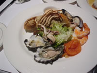 | 「シーフードの盛り合わせ」 こっちにきて初めての生牡蠣に、完全復調じゃない私は少し怖気づいたが、「食べてみたい!」気持ちに逆らえません(苦笑) むふ、うん。 日本の岩牡蠣のようなクリーミーな感じが口に広がります…正直、岩牡蠣があまり得意じゃない私には、ちょっと厳しいです。 この後、2人の卒業祝杯はホテルの部屋で深夜まで続いたのでした。 |