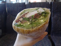 | フェリーに乗船する前に購入した“チキンラップ”A$3.5。 シドニーに着いてはじめての食事。たくさんの野菜と蒸し上げたチキン、味は薄いけど、新鮮な野菜のシャキシャキ感がGOODです。 お腹の調子が完全よくなった訳じゃないけど、食欲も沸いてきたので一安心。せっかくの旅なんだから、おいしいものいっぱい食べたい。。。 |