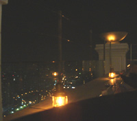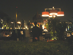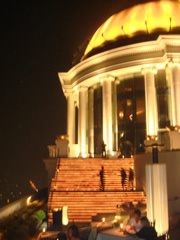 シアワセな夕食を終えて、バンコクの今☆話題のスポットへ。ドレスコードもしっかりあるセレブなお店は、バンコク市内のビルの屋上64階にあります。 64階で、遮るものも安全装置も見当たらない完全な屋外。ソファー席から、下をみたら、壊れたフェンスがあるだけ…ひゃーコワイっ!!! タイ人はスタッフばかり…お客さんはほとんどが欧州の人ばかりです。 建物の突き出たところにバーカウンターがあり、そこでまた1杯…すっごくステキな場所なんだけど…高所恐怖症の私には、ちょっと厳しい(笑)。 |