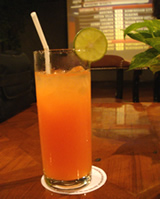 スワンナプーム空港から、渋滞に巻き込まれつつ車で約1時間。 バンコクで一番有名な夜の街「パッポン通り」の、向かい側に建つホテル・この旅の宿「モンティエン・バンコク」に到着。 ホテルのWelcome drinkは、「Sawasdee Cocktail(サワディー・カクテル)」…中身は、あまーい南国の“フルーツジュース”(パパイヤ・マンゴ・パイナップル…)に“メコン”…タイのウィスキー(タイ米焼酎にウィスキーフレーバーを添加したもの)を入れたカクテルです。 普段、甘いお酒はあまり飲まないのだけど、フライトの疲れもあってクピクピ。。。 |