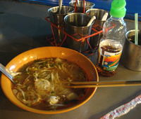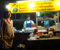 午前2時。 相方と2人、ホテルの隣りの駐車場に、夜だけOPENしている屋台で、「センレックナーム」を食べた。 砂糖・唐辛子・酢・ナンプラーで、好みに味付けして食べるこのタイ風米麺。 …酔っ払って入れすぎた調味料が喉を刺激して、ゴホゴホとのたうちまわる。…そんな姿に2人で大笑いして…… |