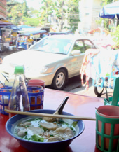 道のいたる所にある“ゲストハウス”や、カフェには、様々な国の人たちがたむろしています。 オシャレなカフェでは、欧州人が分厚い本を読んでいたり、露店の脇には、ヒッピーらしい服装の若い女性が、ただただぼーっとしていたり…。 ここの周辺で感じる空気のゆらぎが、私がここ数日過ごしてきたバンコクのイメージと違います。でもなぜか居心地がイイ…私もこの人たちに混じって、夕暮れまでぼーっとしてたいような…そんな誘惑に負けそう。。。 …あ…気がつけば朝から何も食べてなかった…。 そしてやっぱり今日も「センレックナーム」。 ここのセンレックナームは、この旅一番の具たくさん☆美味しかった。 |