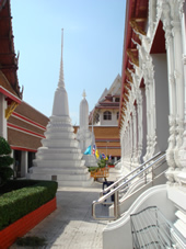 「カオサン」を後にして、「王宮」へ向おう!と思って、ボートを降りたものの、小さな露店がひしめき合っていて、どっちがどっちなのか…よくわからなくなってしまった。 そして、なんとか辿り着いたのは、どうやら「Wat Mahathat(ワット・マハタート)」という寺院らしい…。 中へどんどん進んでも、観光客は一人もいない。 新品同様の仏像と真っ白い建物。 次第に、騒がしかった露店の声や車の音さえ聞こえなくなる。 照り付ける熱い日差しと、“しん”とした静寂。 だれもいない。 ……白昼夢?…… |