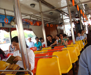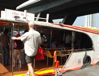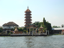 バンコク滞在4日目は、一人で散歩。 チャオプラヤー川のツーリストボートで王宮方面へ。 “朝9時半〜午後3時半の間、チャオプラヤー川のボートに乗り放題のツーリストチケット”120B(≒350円)を買って、乗り込んだ船には、たくさんの観光客。 ここでも、欧州人ばかり、日本人観光客はいませんでした。 船が出港すると、係員の人がマイクを使って英語で、川沿いに見える建造物などの説明が始まりました。 |