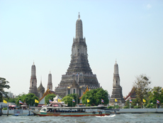 | 出航して、しばらくすると、川沿いにある“タイらしい建築物”がいろいろ見られます。 「Wat Arun(ワットアルン)」写真→。 通称=“暁の寺院”の美しさは、何度みても感動します。 今度は、早朝か夕暮れに見たいなぁ…。 船に乗っていると、川を渡る風が心地よく、バスやタクシーでは、味わえないバンコクの空気を感じることができるので、このボート超オススメ☆ |