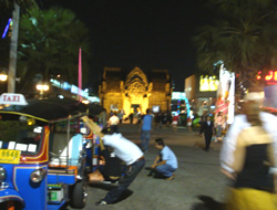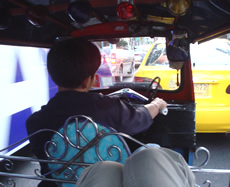 | 買い物が終わって、ホテルへ戻るとギフトちゃんが遊びに来てくれました。 ホテルのそばにあるネイルサロンで、2人並んでネイルケア。足と手あわせて750B(≒2500円)…タイにしては、こちらもちょっと高いですが、2人並んでお姫様気分♪ ……その後、ちょっと早めの夕食へ。 “トゥクトゥク”(写真→)に乗るのは、人生初☆。 乗る前に行き先を告げて、値段を交渉します。もちろんギフトちゃんがタイ語で交渉してくれたので、ぼられる心配ナシ。 で、乗り心地ですが…もぅスゴイ乱暴です(笑)…渋滞している道の車の間を縫う様に、かなりのスピードで走るので、つかまってないと落ちるうぅ〜〜! |