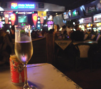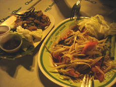 ギフトちゃんのママの店とその隣りの姉御の味が忘れられず、ここのソムタムには、満足できません。 しかも生で添えられている野菜は、スカスカで、箸休めにならない…(涙)。 でも、まだ日中の暑さが残る夜風と、冷えた白ワインと、辛いタイ料理…すごく心地いいな。 |