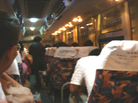 停留所でバスを待つこと数分。どんどん人が回りに集まってくる…この時点では順番なんか無いようだ。 ところが!バスが停留所に近づくと「我先に!」な勢いであっと言う間に長い列。 私も負けじと並んだものの、広東語しか話さない“バスの女子係員” …「この人に荷物を預けて大丈夫なのか!?」 とめっちゃ不安に…かといってバスの中に持ち込める程小さくない荷物、あぁ〜どーしよ……そうやって私がオタオタしてると、後ろからきっつい目で見られ、早口の鋭い広東語でまくし立てられる(怒ってるように聞こえる…泣)。 で、なんとか乗り込んだ車内はガンガンに冷房が効いていて、にゃ〜涼しくてよかった〜♪ ところで、バスに乗り込んでいる90%が中国人で、私の隣にはでっかいドイツ人、そして後ろには黒人3人(この人たちの携帯着信音は爆音量…声も大きい) |