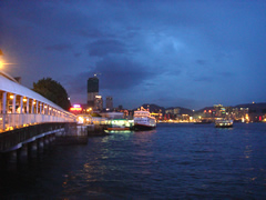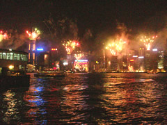 午後7:45 ホテルの側から出ている「スターフェリー」に乗って、九龍半島側へ。 そして、九龍半島側のスターフェリー乗り場から、花火を見ました。 この花火を見るための人で、もっと混雑しているのかと思っていたのに、スターフェリー乗り場の待合室窓にへばりついて見ているのは、私一人。 |
