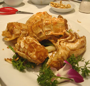 | そして、店員さんがガシガシ動いている活きのいい蟹を持ってきて、R女史に「これでいい?」と確認…しばらくしてから、その蟹が「ニンニク炒め」になってテーブルに運ばれてきました。 大きな爪を割って、身を齧ると筋肉のぷりぷりした感じがたまらん♪火の入り方も絶妙。 香ばしく炒められたニンニクをのせながら食べると、むはぁっ〜美味しくって、うれしーくなっちゃいます♪ |
