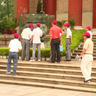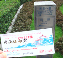 ホテルから、5分ほど(約9元≒144円)で到着した「中山記念堂」。 まず、公園内に入るために5元≒80円。 建物内部に入るためには、さらに5元必要というので、外観を一回りしてこの場を離れようとしたら、←中国人の団体観光客が…近頃では、日本の小学生の修学旅行でも最近被ってるのをみない体育帽(!?)。 |