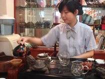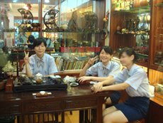 私が持っていた「指差し広東語」の本をみながら、キャキャと楽しそうな3人…。もっといろいろ話しをしたいけど、私も彼女たちも共通のコトバがなくて、もどかしい…。 飲ませてもらったうちの3品ほどを購入。 2月に香港の空港で買った中国茶の約3分の1の値段でした。 |
