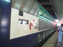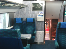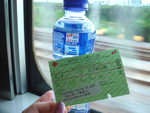 「出国審査場」を抜けると、再び待合室があり、そこには免税店☆…陸路での国境越えに慣れていない日本人な私なので、なんだかちょっと違和感を感じます。 私たちが乗るKCR(九廣鉄路)の電車は、たまたま最新式。座ってまもなく水のボトルのサービスがありました。 普通席(1等席)でも、フカフカのシートと結構広めの足元で乗り心地いいです。でもエアコンが効きすぎていて、寒かった〜。。。 |