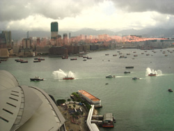 朝、目を覚まし、窓の外をみると、たくさんの整列した船がビクトリアハーバーを横切っていきます。どうやら、返還記念式典の催しモノ一つのようです。 飛行機が赤い煙幕を出しながら飛び、整列船とは別の船が、クジラのように水を放水しながらゆっくりと進んでいきます。 窓の下の船着場には、たくさんの見物客がその模様を見ていました。 お祭りの朝みたいで、テンションUP↑↑ |