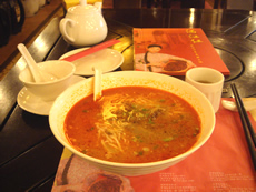 さて、「銅羅湾(コーズウェイベイ)」に着いて、まずは腹ごしらえ☆ 四川料理の「満江紅」で、「坦々麺」を食べることにしました。ここは、旅に出る前に香港のレストラン情報を検索している時に見つけたお店。 看板が大きい割には、入口が小さくて思わずぐるりと一周しちゃった。 |