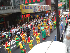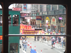 ここからは、トラムに乗って10周年パレードを追いかけます。 トラムの2階に陣取って、しばらく走ると、パレードが見えてきました。たぶんこれは、後ろの方だと思うけど…とにかくめっちゃ派手です☆そして、見物人も数もスゴイ! さっき、ホテルを出た時すでに、一番先頭らしき組のパレードが見えていた…そして私が「坦々麺」食べてる間も繋がって…ってスゴイ長ーいパレードだわ。。。 |