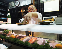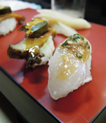 | 今夜は、まだまだ続きます! 広島在住のお仕事関係の知人と待ち合わせ、 お寿司屋さんに連れて行ってもらいました! 席について、まずはビールで乾杯! 「まぁ、とりあえず美味しいの食べてってください。ウチはね江戸前の要素が強いんですよ。でもネタはこの辺りで獲れた美味しいトコ出しますからね」と、ノリのイイ笑顔の大将。 |