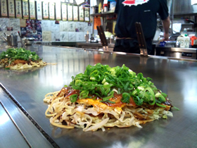 そして、その“オバちゃん”が亡くなった今も、 その味わいは受け継がれているとの事… キレイに磨かれたてっぱんの上で、くるりんぱっぱと“ヘラが踊る” 「越田スペシャル」(そば&イカ天入りネギかけ)950円。 焼き工程の途中で、微妙に味付けが施されるので、少なめのソースでも甘スパイシーな味わい♪口に運ぶヘラがとまらな〜い☆ |