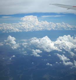 広島へ行くのは、2年ぶり 真夏の快晴の中 飛行機の窓から 遠くの大きな積乱雲 地上は ゴルフ場 碁盤の目に整備された街が …京都かな? そして 瀬戸内海が見えてきた まもなく着陸! |