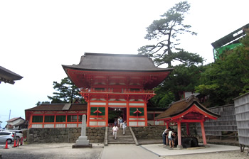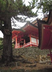 日御碕神社(ひのみさき)神社へ向います。 出雲市内から、日本海沿いを北上していると、海の青、山の緑の中に、ぽっかりと浮き出たような朱色の建物が見えました。 思い出したのは、子供の頃に見た絵本の竜宮城。 さらに、日本海側の切り立った崖を眺めるドライブコースを進んでいくと、小さな漁村にでました。そこに立派な鳥居が… |
