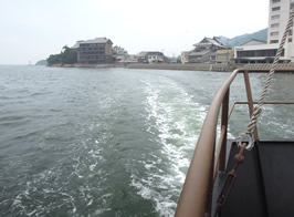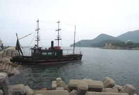 さぁて、 今日の 重要ポイント 「仙酔島」へ 渡し舟、 坂本龍馬ゆかりの 「平成いろは丸」 に乗り込み、 瀬戸内海のしぶき をうけて、 出航5分で到着! |