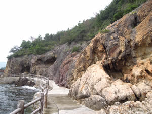 島にある山の頂上の「大弥山(おおみせん)」までは、 残念ながらいけなかったのだけど、 海岸の遊歩道を散歩して、「赤岩展望台」まで来ました。 展望の先へ行こうとしたら、 「ぶーん」 ・・・えっ!!! わぁーーーー!スズメバチ〜!!! 1匹しか目にしなかったけど、コワイ、コワイっ!!! 逃げろー!!!!! |