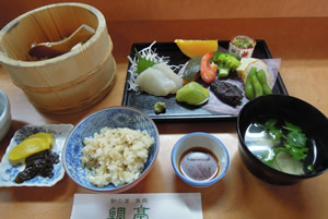 | ランチは、港近くの「鯛亭」さんへ。 「鯛飯」と「鯛刺身」がどうしても食べたくて、 ちょっと奮発「鯛めしデラックス定食」(1680円) 鯛の旨みたっぷりの「鯛めし」に満足。 野菜や、甘味はいらないから、お刺身もう少し食べたかった(笑) |