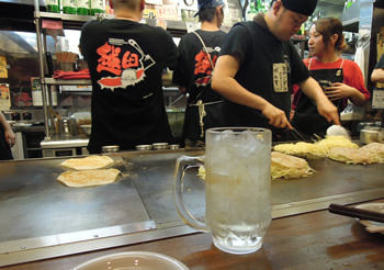 | 3軒目「お好み焼き 越田」。 正直、満腹です。 でも、宿泊ホテルの近所にあるこの「越田」には、 相方もお知り合いの、ノリ♪の素敵な店長さんがいて、 酔っ払うとその笑顔に会いたくなるんだなぁ… 「ぃっらっしゃーいっ!!」って声にホッ。 さて、、、 「ハイボール濃い目でください!」 |