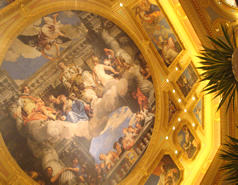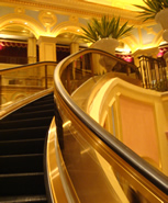 カジノの中心には、宮殿のように螺旋階段 があり、その螺旋階段がエスカレーター!!「まあるくカーブするエスカレーターを見たのは、始めてだ!」と母も大興奮。 その階段の上には、ホテルの客室やショッピングモール…。 2人で案内コンピュターを使って、歩き回ってみるけど、あまりに広すぎて、ほとんど迷子。 スゴイ…いや、ホントスゴイ…。 でも、なんだろう、微妙にしっくりこない。 マカオは、アジアらしさと、ポルトガル統治時代の雰囲気とが交じり合った“歴史ある街”情緒溢れる場所。でもここは、そういう情緒がまったくなくて…マカオの情緒が好きな私には、あまり居心地よくないなぁ。 …でもスゴイ。 お金・金・金…っていうコトですね。ふぅ〜・・・・・・ |