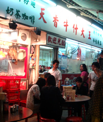 衣料品がものすごく安い♪ 日本でも十分使えるカジュアルな洋服が1000円ほどだせば上下コーディネイトできちゃいます。母とおそろいの洋服購入…これも思い出になるね〜(^^; ストリートの脇道では、地元の人たちが、“香港らしい食堂”で食事中…美味しそうな匂いが…♪ お買い物を楽しんだ後は、スターフェリーに乗って、九龍半島へ。 |