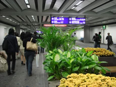 ----4時間半の空の旅を終え、到着した「香港国際空港」。 花や観葉植物が少しだけやわらかい雰囲気を作ってるけど、昨年末行った「上海」の空港と同じような、ちょっとひんやりした空気をこの空港でも感じるのは私だけ? そしてイミグレーションでは、なんだかつんつんしてる係員に、「帽子をとれ」と睨まれ、さらにパスポートをポイっと投げ返され、「はい次っ!(アゴでしゃくりながら)」と急かされた忍ちゃん…香港的歓迎(?)にちょっとヘコんでいる。 |