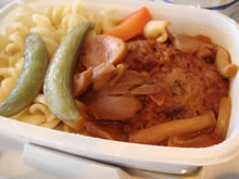 | JL731便 成田→香港。 満席の機内。白ワインを飲みながら、おつまみつまんで、先行上映の「ナイトミュージアム」を見始める。 出発前日まで仕事だったお疲れの忍ちゃんは、爆睡zzz。 機内食は、ハンバーグ(写真→)を選んだ。コレがなかなか美味しくて、今日3本目になる…赤ワインを一緒にオーダー。うん!やっぱり“空”の“酔い”はサイコーじゃ! |