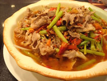 香港に着いて、初めての食事・・・まずは「青島(チンタオ)ビール」で乾杯! 英語を話せるウェイトレスのおばちゃんもいるので、なんとかコミニュケーションとれてます。でも、火鍋の食べ方の説明がイマイチわからず、アラカルトをオーダーしてみました。 「牛肉を辛いスープで煮た物」・「きしめん風の太い麺に牛肉を五香粉で味付けしたあんかけ」。 他にも気になるメニューはあったけど、この2つスゴイ量!!!4人くらいで食べるのがちょうどいいサイズ。2つしか頼んでないのに、残してしまいました。。。 |