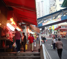 翌朝、今日もやはり曇りで、外はとても寒そう。 朝食を食べるお店を探しがてら、ホテル近くを散歩。 この辺りは、乾物問屋だけでなく、新鮮な野菜や肉を売っているお店や卸っぽい大型スーパーも多く、朝から忙しく香港の人たちが行き交っています。 さて、朝食・・・ 入口に大きな蒸し器が置かれたお店に入ってみました。 ここのお店の人は、昨日出会った香港人のようにつんつんしてなくて、言葉のわからない私たちにも普通に接してくれました。 |