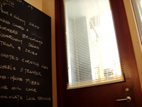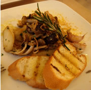 興味をそそられて、入ってみると、これまたシンプルモダンでこじんまりとしたレストランカフェ。 メニューは、入口横にある黒板に書かれた英語のメニューのみ。 店員さんが、はじめ広東語で話しかけてきたが、“わからない”顔をすると、今度は英語でオススメの料理、料金などを話してくれた。 私たちは、店員さん広東なまりの早口英語を50%くらいしか聞き取れず(汗)、適当に気になるメニューをアラカルトで2品と白ワインをグラスでオーダー。 平日の昼間から、クピクピワインを飲みつつ、食事している女2人。 |