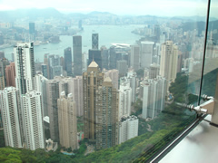 …でも目指すのは、この建物の最上階にある展望台。 そして・・・。 香港の高層ビルを見下ろす景色がどーん! 夜にくればきっと夜景もキレイだろうなぁ…でも昼の景色も迫力満点でGOOD!…って私は高所恐怖症なので、ホントは腰が引けてました(笑) |