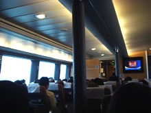 でも出国審査場が空いていたので、乗り場に到着した時は、1本前の船がまだ停泊していた。 …係員に「早くこいっ!」と手招きされて、行ってみたら、その前の船に乗せられちゃった。 ホントは、窓側の席に座りたかったんだけど、与えられた席は、一番後ろの通路側(涙)。しかもほぼ満席。 ただ、ランチで飲んだワインの酔いが覚めてグッタリし始めていた私たちは、約1時間の船旅を心地よい揺れに任せて爆睡zzz。 |