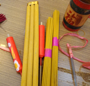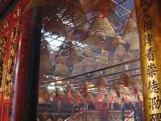 「文武廟」は、香港島最古の廟…ってコトで、観光客多いです。 でも日本人より、白人が多かった。 日本で言う“社務所”みたいなのはないけど、入口付近でお線香セット売ってました。ロウソク+線香(固まりで持つと腕の太さくらいある大きなもの)を買って、せっかくなので、お祈りすることにしました。 中に入ると、日本式とは違う参拝の仕方で、みんなカラダを大きく揺すって、頭を何度か下げています。正座して頭をこすりつけている人もいました。きっととても大切な願いがあるんだろうな・・・。 線香の煙が立ち込める中で、私も長く手を合わせてお祈りしていると、ポトっと上から円形の大きな線香↑の燃えカスが落ちてきて…ビクっあぅ…って、ホントびっくりしたよぅ。 |