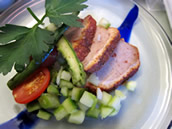 | 左から 「鴨の冷製〜China Spice」 「ズッキーニのサラダ」 「テンダーロインステーキ」 ステーキに合わせた赤ワイン 南オーストラリア 「Peter Lehmann」 Barossaのシラーズ |