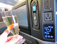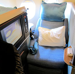 乗り込んだ機体は、最新の機材☆ 斜めに配置されたシートは、 全て仕切りがあり、プラバシーが守られていた。 シートを倒すと、もちろんフルフラットにもなっちゃいます。 テレビモニターがかなり大きくて、引っ張りだすと顔の正面にどーんっ! 大きなカラダの外国人の方は、ちょっと狭そう。