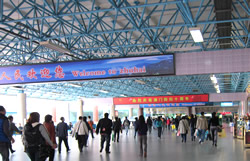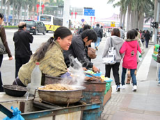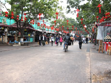 そして中国側の国境を抜けると… だだっ広いコンクリート広場に、“春節”のドデカイ装飾。 イメージどおりの中国がそこにあった。 大きな通りを繁華街と思われる方向へ歩いていくと、 そこらじゅう生活のにおい。 ブランドバックを持った若くてキレイな女性も多いけど、 化粧気のまったくないおねーちゃんが焼き栗を売っている。 大きな通りを少し外れた所で、 まるで渋谷のような雰囲気の小道を発見した。 |