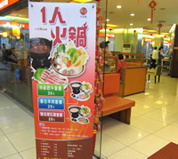 さらに小さな商店が入ったビルの2階に、 ←この“のぼり”を発見。 「お!いーじゃん“1人鍋”」 この店でも、英語は全く通じず、身振り手振り、筆談で、何とかオーダーできた。 そして出てきた… →こんなボリュームのセットが25元(≒340円) 1人で鍋を食べていたら、他のお客さんから、なんだかすごーく注目されてる…中国って、“1人飯文化(特に女性)”が、ないみたいです。 頭がおかしい人と思われている感じがする… |