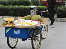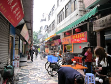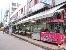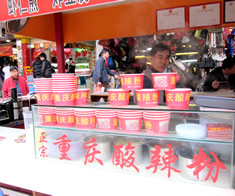 道の端にはずらりと屋台。 その奥には、若者向けのバックや靴や洋服が並んでいて、さらにその奥には、小さな美容室やエステルーム、化粧品売り場がひしめき合っていた。 とりあえず、屋台に座ってみた。 屋台イチオシらしいメニュー「酸辣粉」を指差すとおじちゃんは「OK」という顔をした。 すっぱ辛いスープ麺…おいしーじゃん☆ |