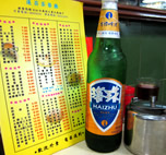 | ぶらぶら…歩きつかれて、近くの定食屋へ。 テーブルの横に「MACAU BEER」の文字発見☆ そういえば…まだこっちにきてから、 “マカオビール”飲んでない。 …しかしやはりここでも言葉は全く通じない。 「MACAU BEER」を指差しても首を振るばかり… 「こっちに来い」と、アピールされて、 ビール用の冷蔵庫をみせてもらったら、 …ない… どうやら売り切れ(泣) 仕方なく頼んだ海珠ビールは、不味かった(哀) |